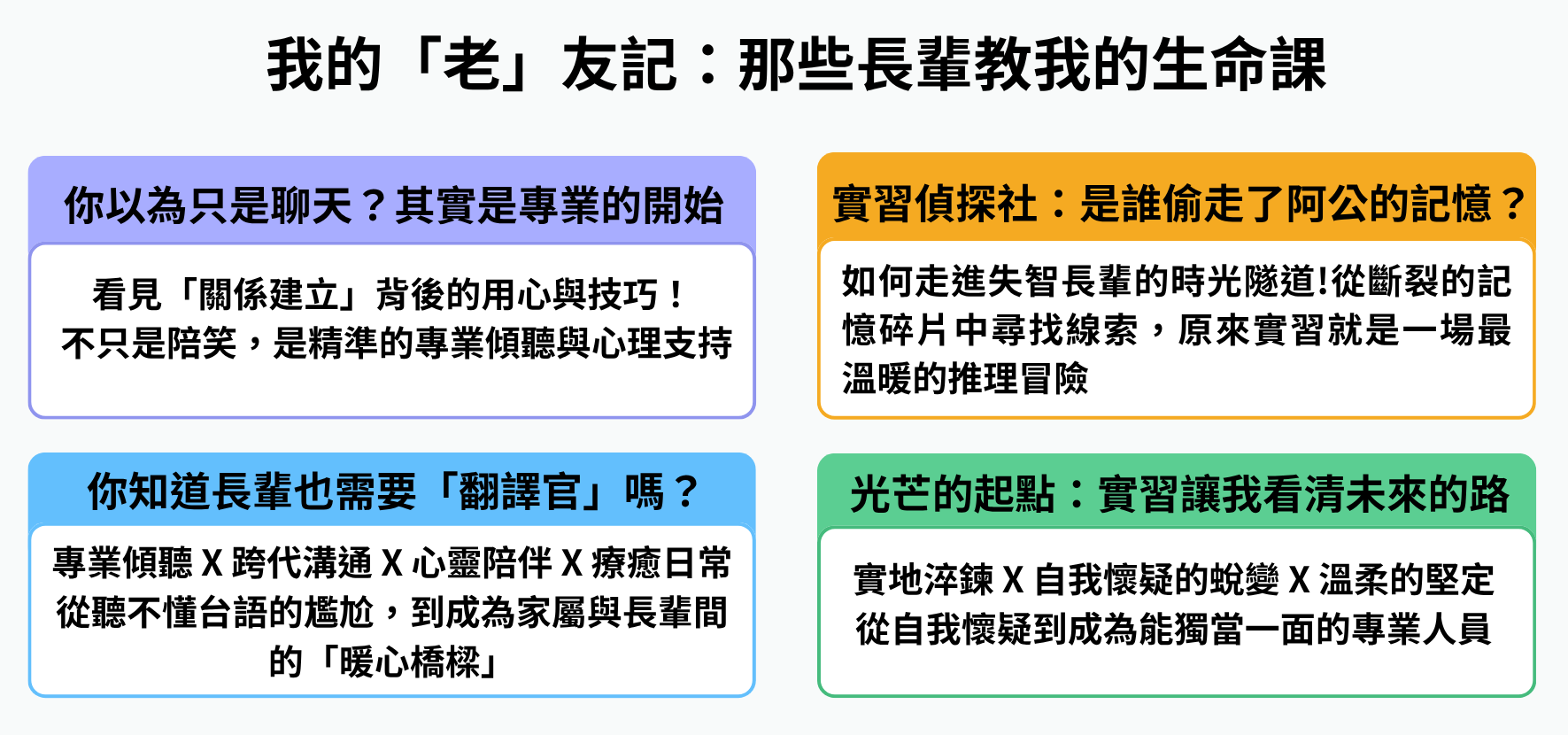 「560小時的實習,見證了我從自我懷疑到自信專業的蛻變。起初對業務的生澀不安,在督導悉心引領與專業薰陶下,轉化為挑戰自我的勇氣;從家屬與長輩肯定的眼神中,我更看見了真誠服務的力量。結束是另一段旅程的起點,我將帶著這份溫柔與堅定,持續在社會角落傳遞暖光。」