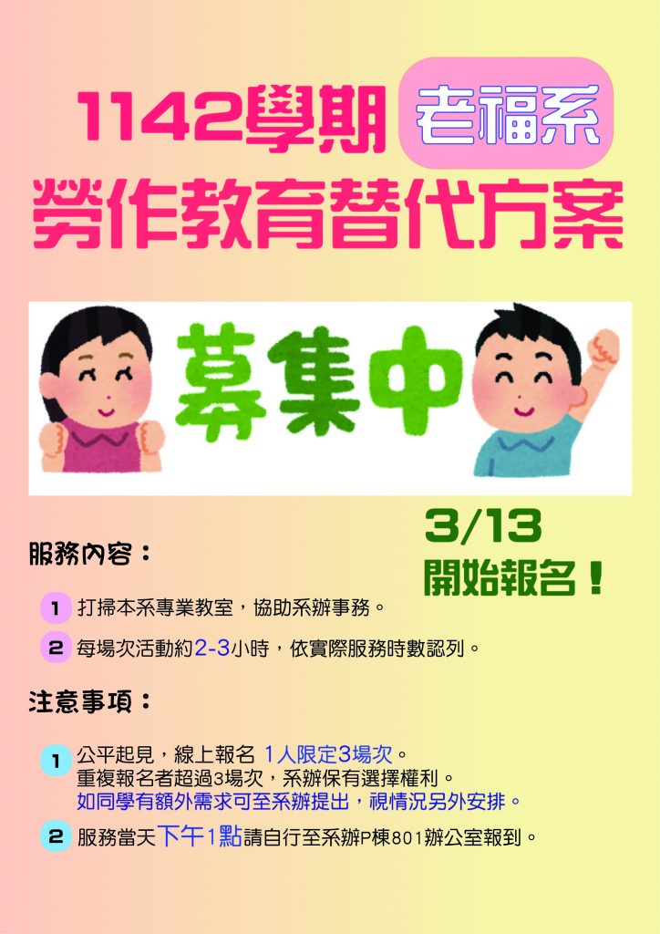 [1142學期]弘光老福系勞作教育/志工活動03/13(五)開始報名!